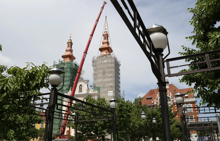 Daruk emelték a Minorita templom tornyaira az elkészült csúcsokat.