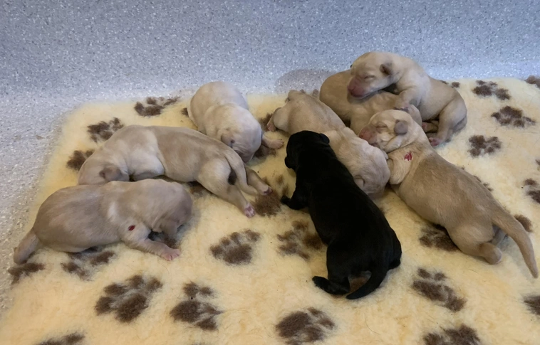 Nyolc gyönyörű labrador született a Baráthegyi Vakvezető Kutya Iskolánál. Az anyakutya szépen gondoskodik most háromnapos kölykeiről.
