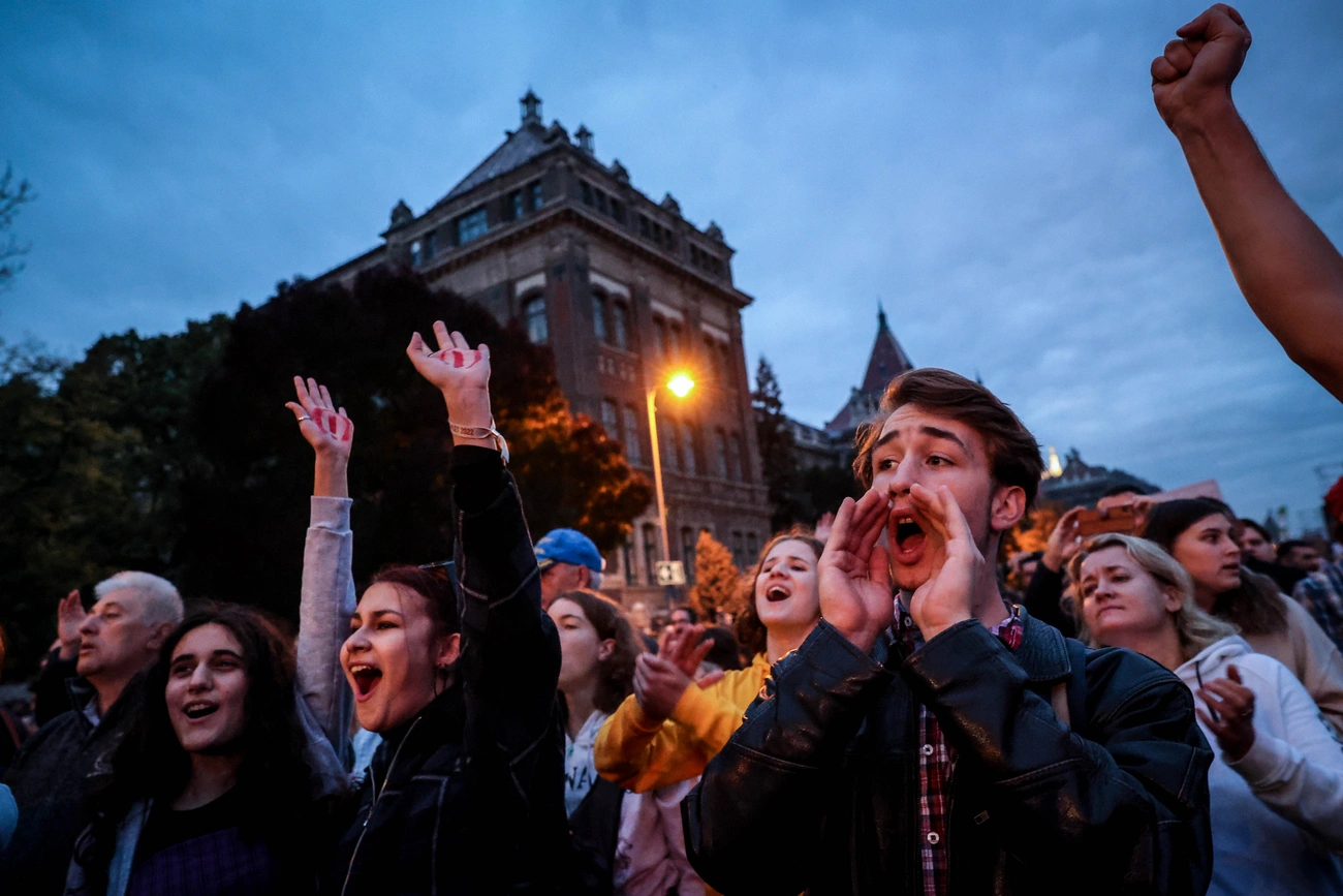 Schermann Fruzsina, az ADOM Diákmozgalom elnöke úgy fogalmazott, "nem félünk, nem hátrálunk, nekünk van igazunk” – mondta. Szerinte több mint 50 ezren vannak a tüntetésen. “Egy elnyomó hatalom ignorál minket” (…), de nem feledjük a pökhendiséget” – mondta, "és teszünk róla, hogy az ország se felejtsen el minket.”