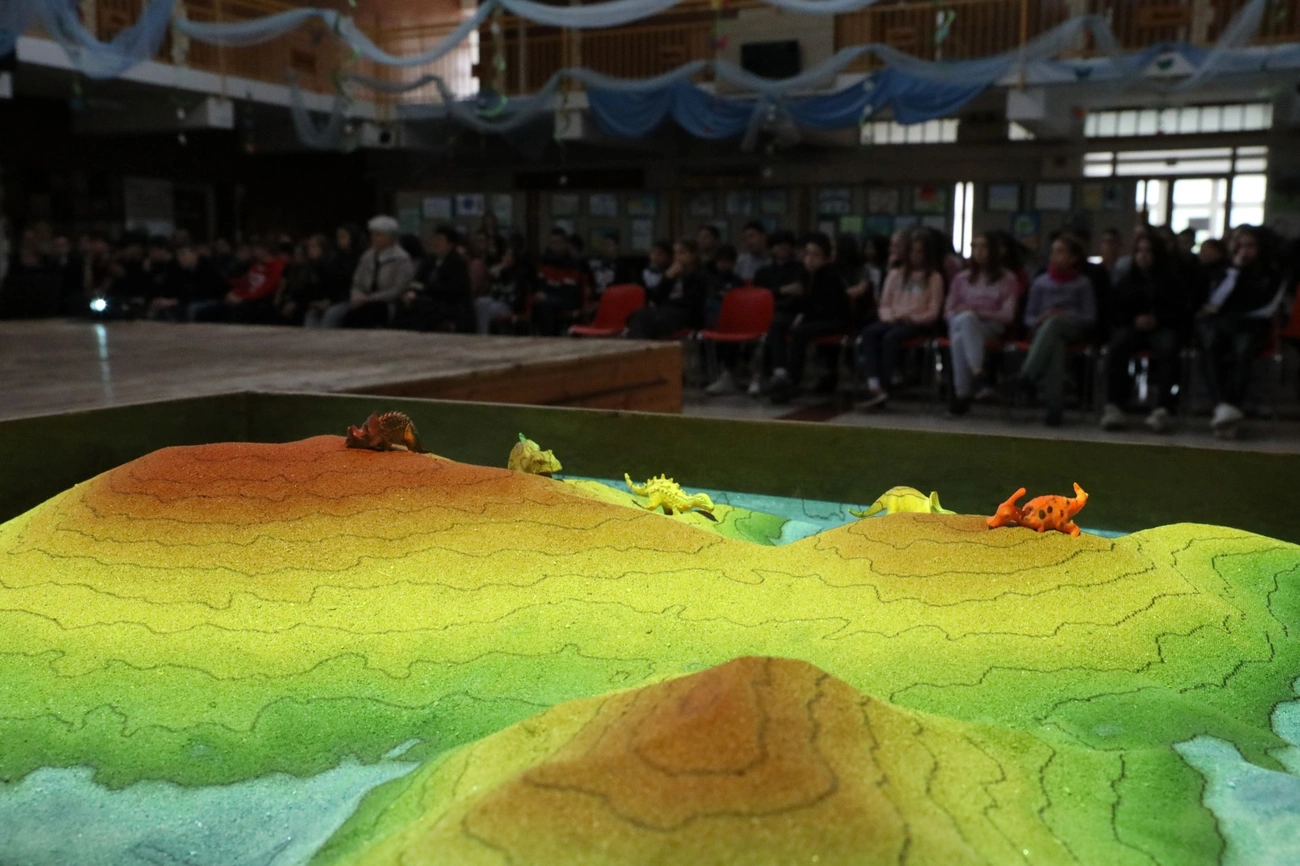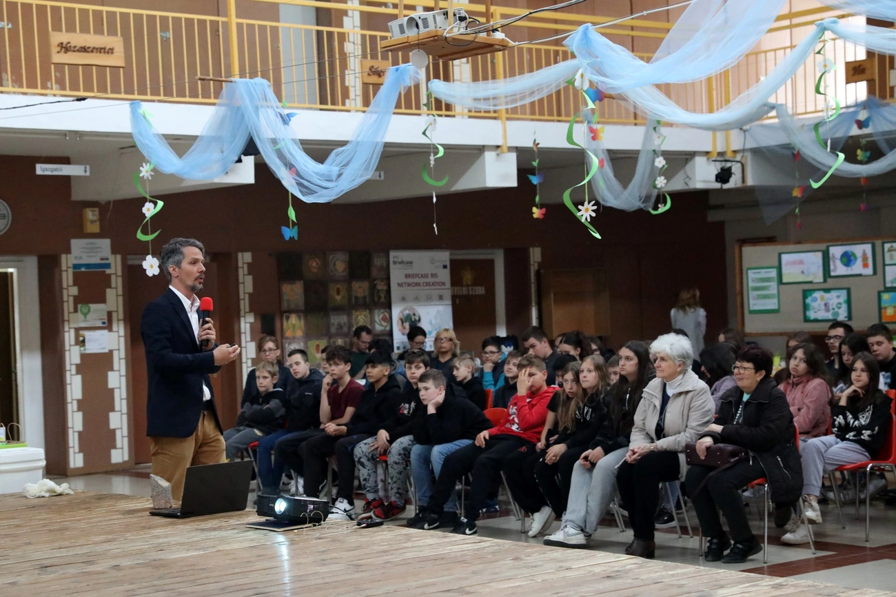 Szalontai Lajos, a Miskolci Egyetem Műszaki Föld- és Környezettudományi Karának egyetemi docense tartotta az interaktív természettudományos bemutatót az iskola aulájában a „nagyoknak”, miközben a kisebbek, beleértve az óvodásokat, a tornateremben élvezték a Diri-Dongó Együttes környezetvédelmi tematikus előadását. Az egyetemi docens elmondta, igyekeztek az előadást arra felfűzni, hogy ha már Komlóstetőn vagyunk, lapozzuk fel kicsit a hely történelmét, például, hogy honnan is ered a Komlóstető név, hogy alakult ki a földrajzi környezete, mi is volt itt több száz évvel ezelőtt.