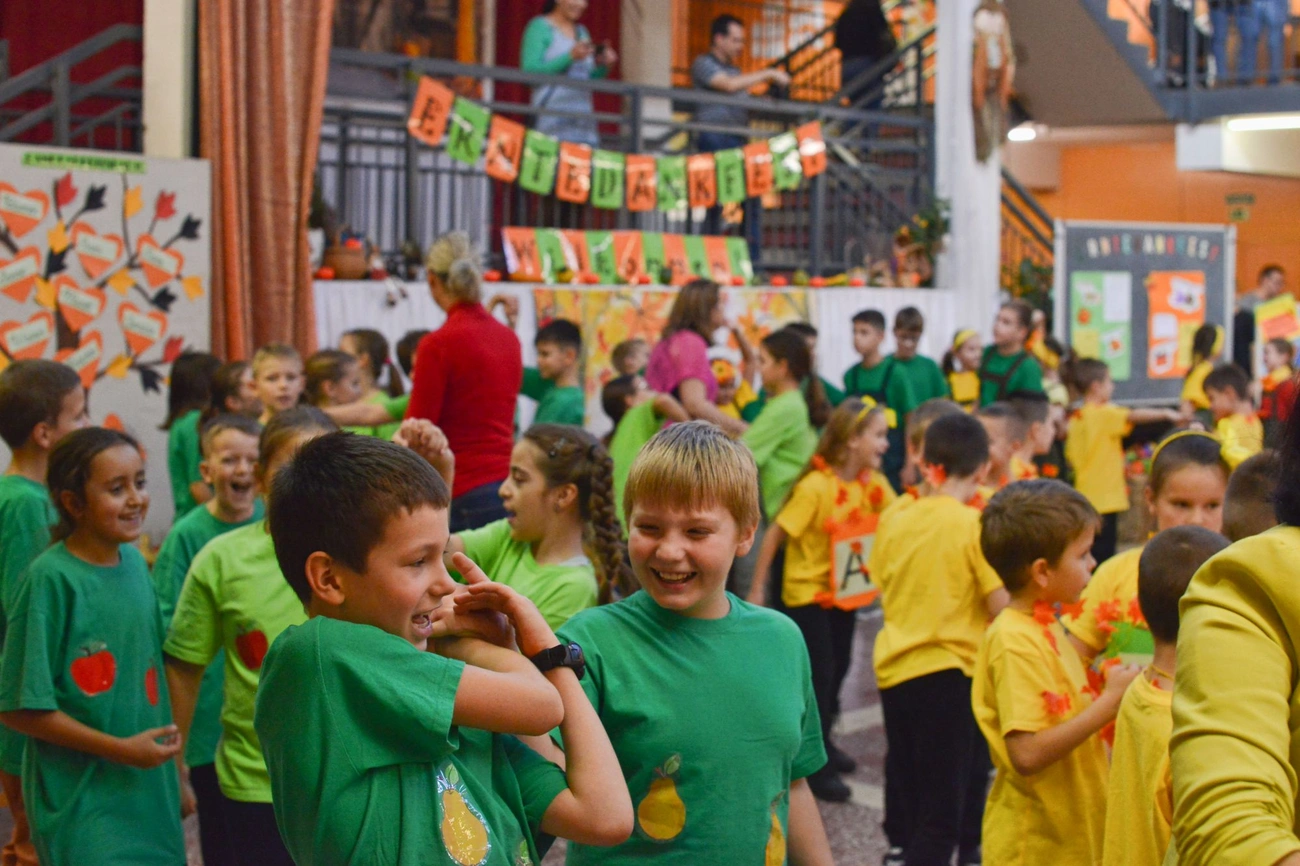 A köszöntő és a gyerekek színes műsora után nagy közös játék vette kezdetét. A kisdiákok körtáncban, mondókázásban, éneklésben vehettek részt, majd a kreativitásukat és a kézügyességüket is próbára tehették például a madárijesztő készítés alkalmával. Az iskola aulájában körben színes állomások várták a kicsiket. Volt köztük többek között fotósarok, "tetováló", valamint kézzel készített vásárfiák asztala is.