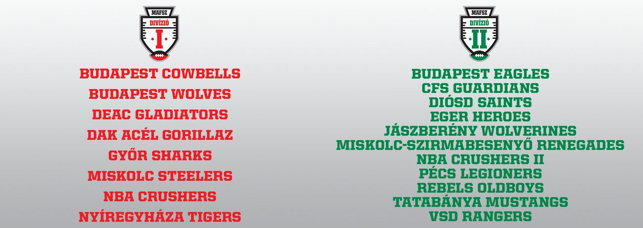 A Fehérvár Enthroners nem kívánt alsóbb divízióban indulni, így idén a regnáló bajnokot nem, játékosait viszont láthatjuk a pályán, hiszen több Divízió I-es és Divízió II-es csapatban is fognak játszani. A Miskolc Steelers-hez és a budapesti csapatokhoz hasonlóan a Győr Sharks is a Divízió I-ben küzd majd idén.