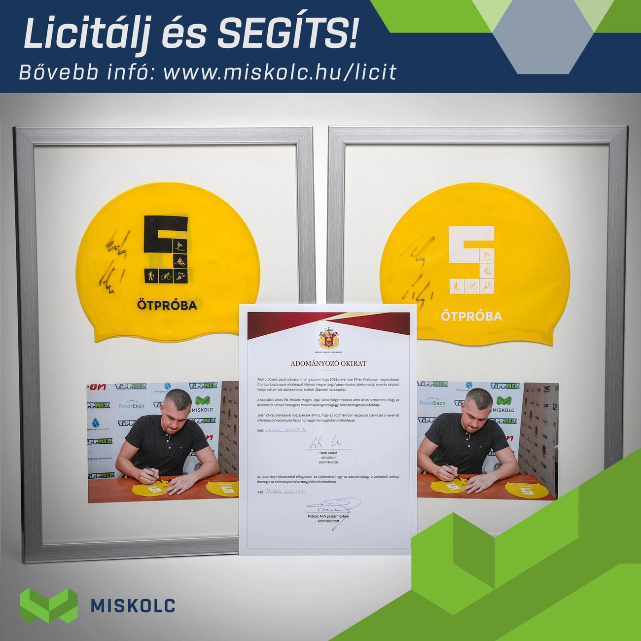 Tavaly novemberben rendezték meg Miskolcon az Ötpróba Úszónapokat. A rendezvényen Cseh László két saját, dedikált úszósapkát ajánlott fel Miskolc önkormányzatának. A hitelesítő okiratokkal ellátott, bekeretezett úszósapkákat most elárverezik és a befolyt összeget célzottan, jótékonysági célra fordítja az önkormányzat.