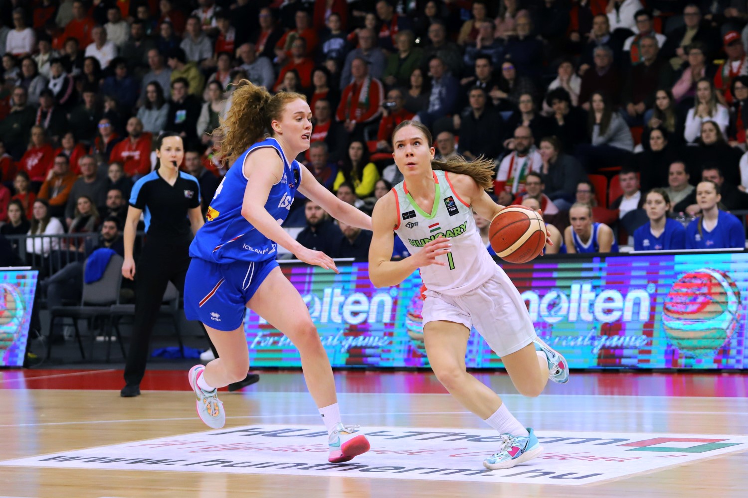 A nemzeti csapat az Eb-részvétel érdekében a lehető legnagyobb különbségű diadal céljával lépett pályára, s ennek megfelelően a nagyszünetig húszpontos előnyre tett szert. Székely Norbert kapitány együttesében a pécsi Kiss Virág és a győri Dubei Debóra ekkor 12-12 pontnál tartott.