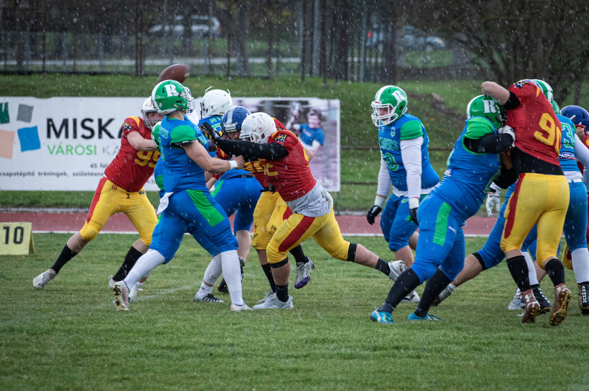 A második negyedre aztán megérkezett a vihar és a jégeső, ami lelassította a játékot, de a miskolciaknak így is sikerült megszerezni a vezetést Nagy Donát elkapásával, amit azonban hamar kiegyenlítettek a vendégek, így a kimaradt extrapontok miatt 6-6-os állásról vonulhattak a nagyszünetre a csapatok.