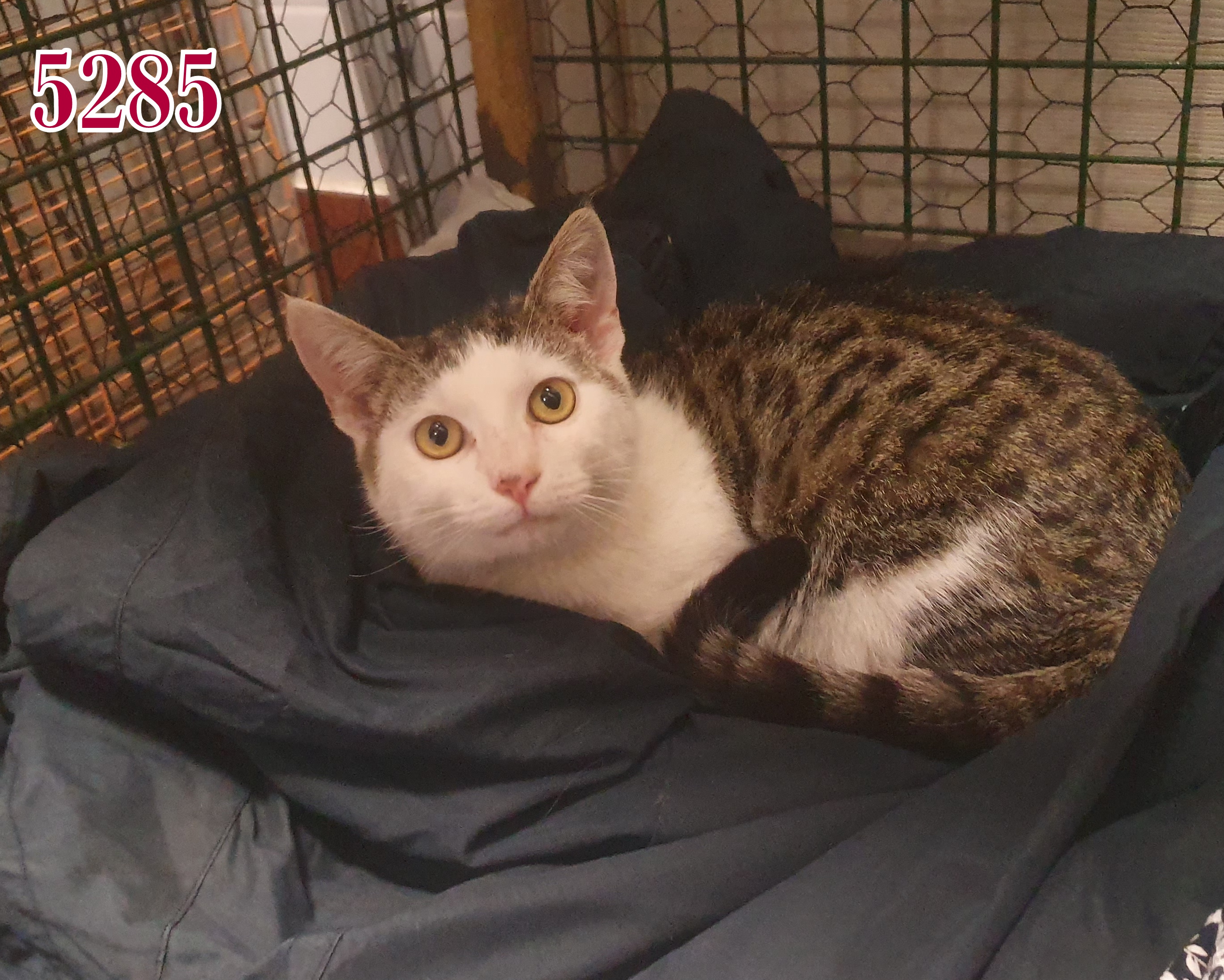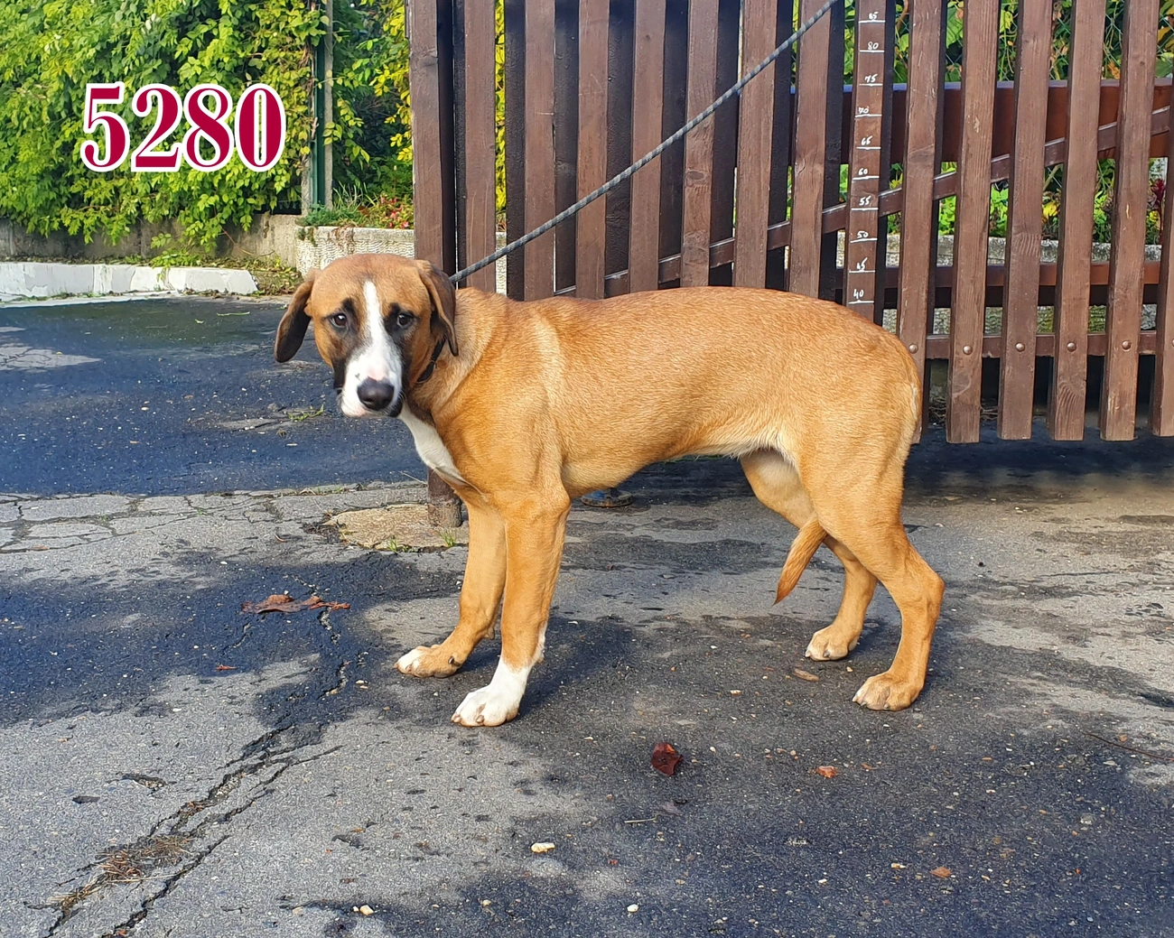 Fiatal, félős új kutya. Kezelhető, de még nem tanulta meg azt, hogy az ember nem bánt. Foglalkoznak vele jelenleg, de egy biztos családra van szüksége, akik tanítják, nevelik. Más kutyákkal nem agresszív.