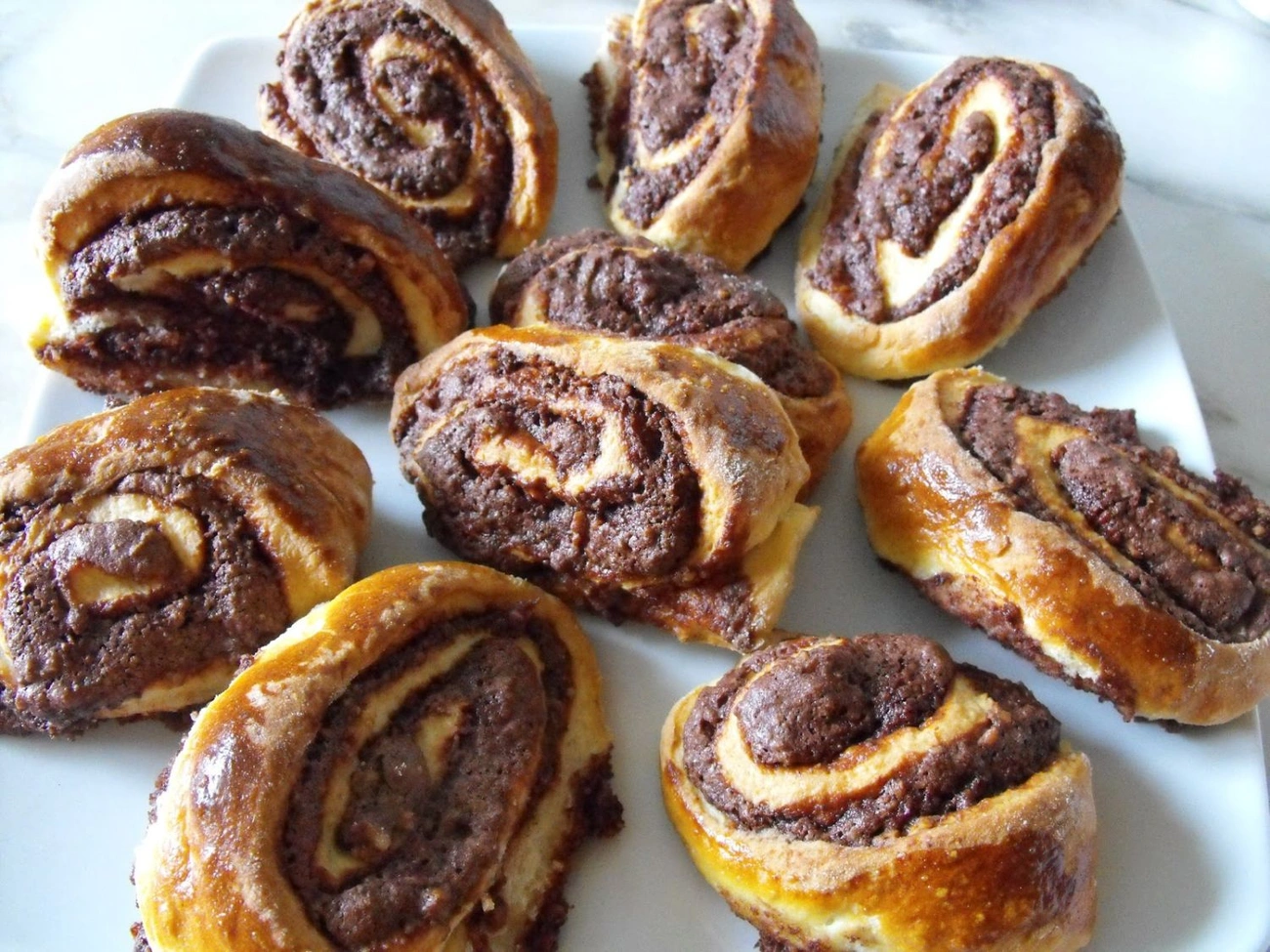 Kelesszünk meg 1dl langyos tejben 1 dkg élesztőt. Gyúrjuk össze 35 dkg liszttel, 12 dkg zsírral és 2 tojássárgájával. A tésztát két cipóra osztjuk, majd hagyjuk pihenni. A töltelékhez felverünk két tojást, majd összekeverjük 15 dkg darált – vagy nagyon apróra vágott – dióval, 15 dkg cukorral, 5 dkg csokoládéporral, fahéjjal és citromhéjjal. Ízlés szerint rumot is teszünk a masszába. Vékonyra nyújtjuk a tésztát, majd a tölteléket vizes kés segítségével elegyengetjük rajta. Ezután erősen, mintha bejglit tekernénk, felcsavarjuk, és kisujjnyi darabokra vágjuk a süteményt. Kikent tepsiben, 180 fokra előmelegített sütőben aranybarnára sütjük.