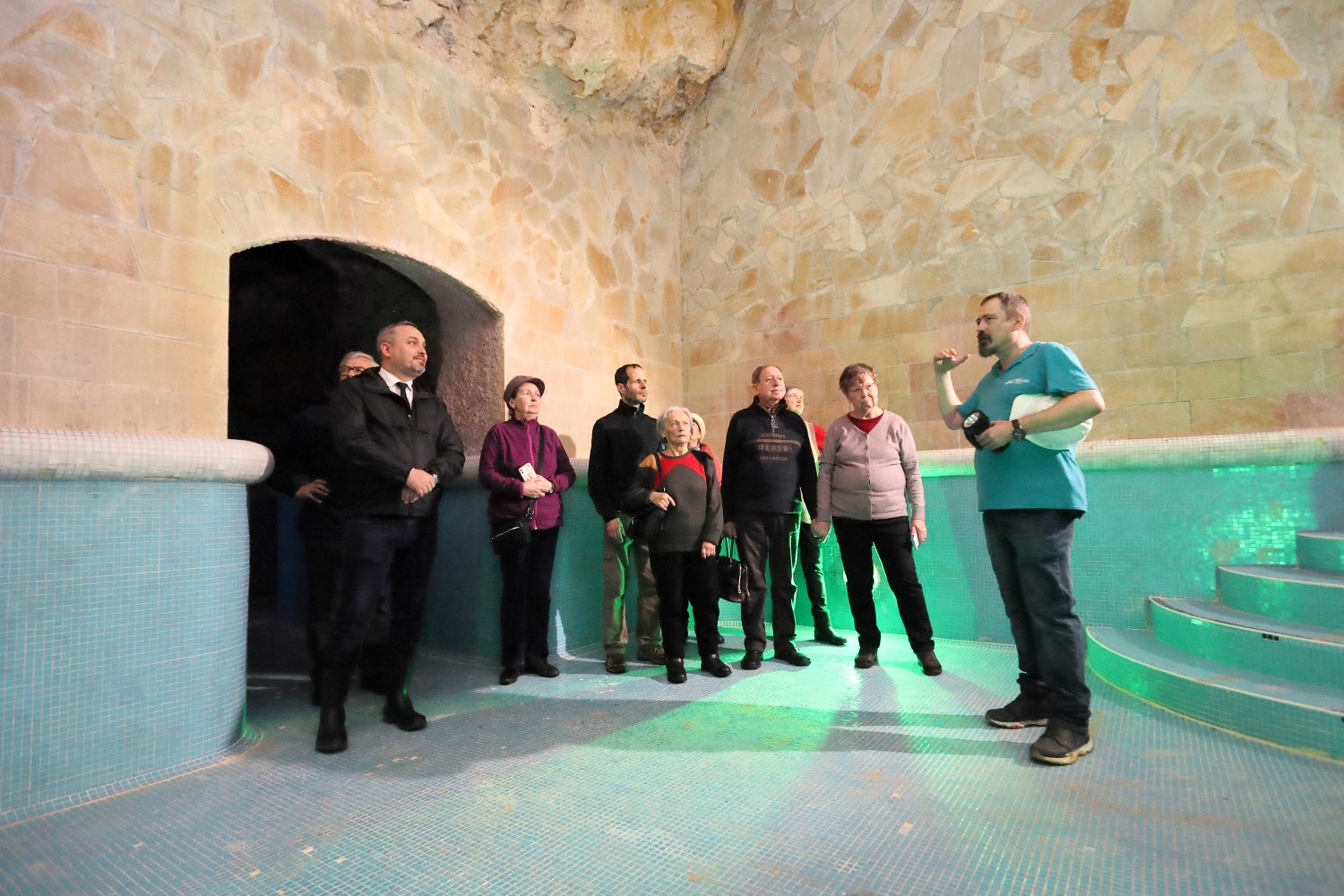 Már az első napon, pénteken is egymást követték az előre bejelentkezett csoportok, akik a fürdő munkatársainak szakszerű vezetése mellett járták be a Barlangfürdő minden zegét-zugát. Az általunk teljesített túrán Molnárné Tóth Edina fürdővezető kezdte az idegenvezetést, aki a híres fürdőhely történetével ismertette meg az érdeklődőket, amit egy alapos kémia óra követett, amelyben megtudhattunk mindent a Barlangfürdő termálvizének összetételéről, a bükki keményvízről, amely gyorsan és szemkápráztató módon vonja be vízkővel – szakszerűen kalcittal – azt, ami tartósan az útjába kerül. És ezt itt senki sem bánja, legfeljebb a gépészek, akik mindennapos küzdelmet folytatnak vele. A dögönyözőknél, medencéknél kicsapódott kalcitrétegek azonban igazi látványosságai és különlegességei a miskolctapolcai termálfürdőnek. Egyedi hangulatot adva a helynek a sziklákon, kürtőkön és a barlangjáratokon túl. Ezeket a részeket már Rigó Attila műszakvezető kalauzolásával ismerhette meg közelről a túracsoport.