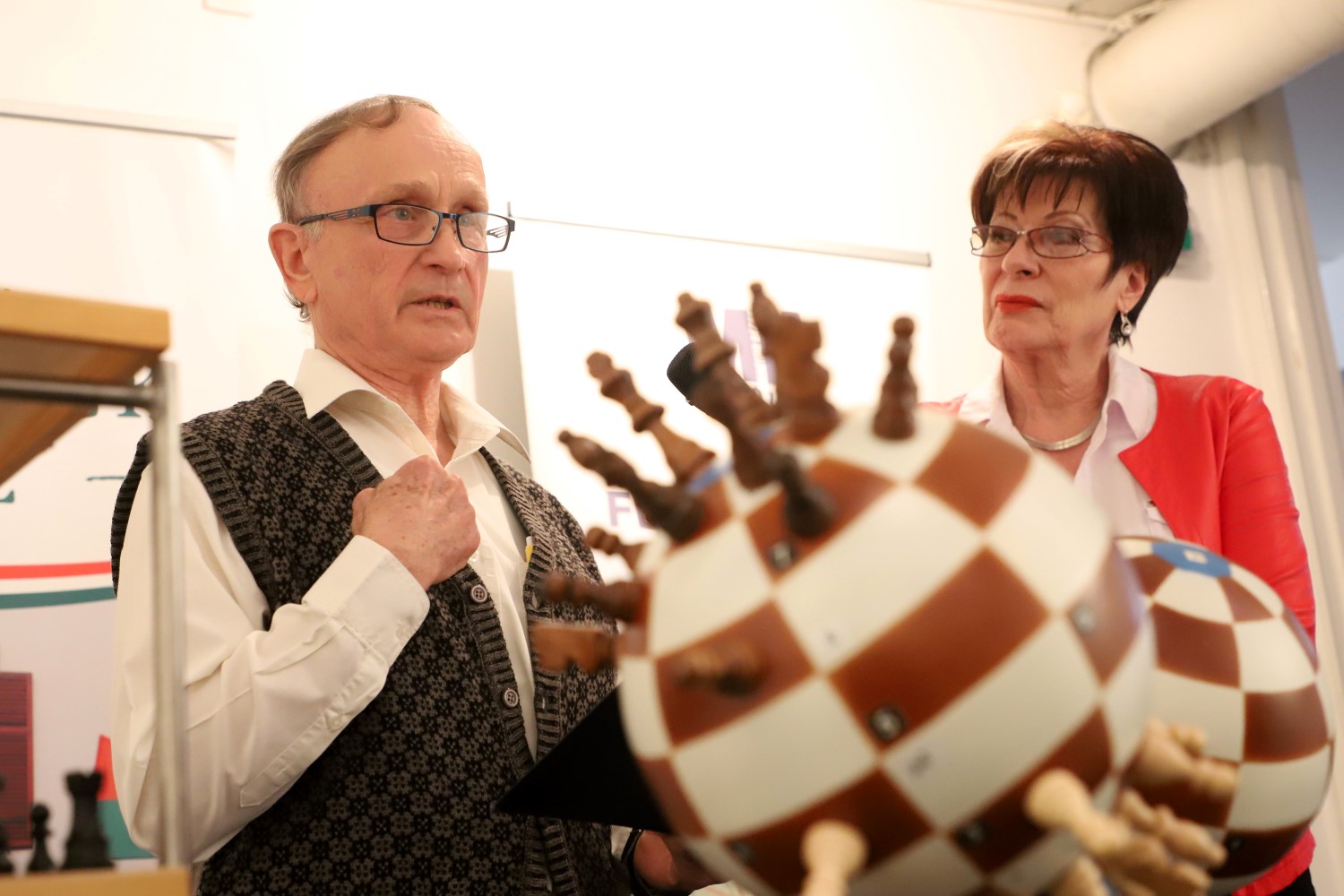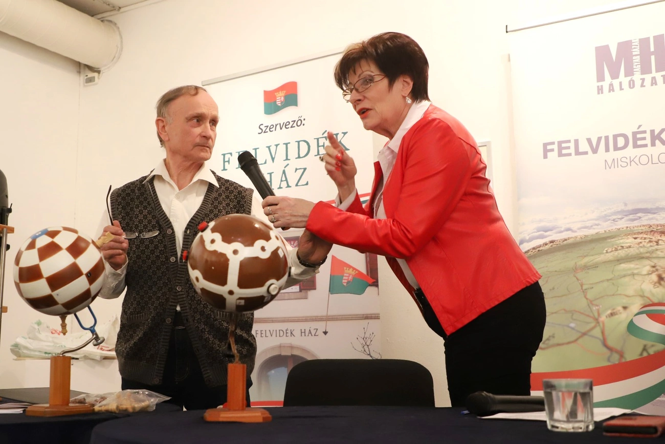 - Egy fantasztikusan érdekes témával vártuk ma a vendégeket. Boholy János a Felvidéken él Bátkában, én még rádiós voltam, amikor először találkoztam vele, és nagyon meglepett, amikor elmondta, hogy annyira utálta, hogy sokszor sarokba szorították a sakktáblán, hogy ő bizony feltalálta a sakkgömböt. Ettől kezdve többé senki nem szorította őt a sarokba. Úgy gondoltam, ő egy nagyon érdekes és színes egyéniség, akit érdemes bemutatni itt Miskolcon is. Ma elhozta a gömbjeit bemutatni, amelyek tényleg nagyon különleges látványt jelentenek. János sok helyen mutatta már be a tudományát, külföldön is, de az emberek nem mindig értik, hogy is lehet egy gömbön sakkozni. Ezt most a miskolci közönségnek magyarázza el – ismertette Mács Ildikó, akitől megtudtuk azt is, hogy a feltaláló folyamatosan fejleszti a gömbsakkot, megígérte, hogy legközelebb elhozza Miskolcra a készülő emeletes változatot is. Boholy János már nyugdíjas, de tele van energiával, és imádja a sakkozást.