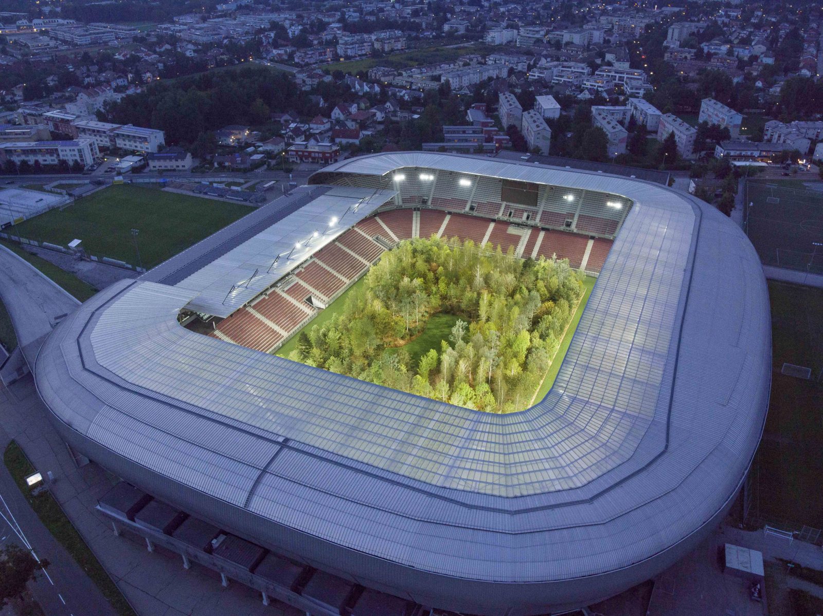A szokatlan művészeti akció magánadományokból állt össze, 7000 köbméter faforgácsot, 4500 négyzetméter gyepszőnyeget és 10 kilométernyi vízvezetéket használtak fel hozzá. Az erdősített arénát így értelemszerűen nem tudja használni a város másodosztályú futballcsapata, amely a kiállítás idejére egy másik stadionban játssza hazai mérkőzéseit.
