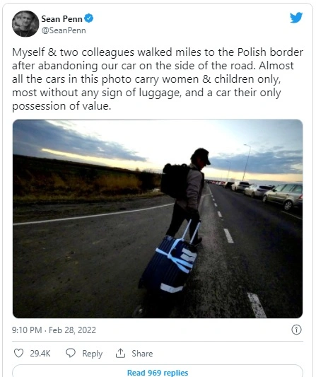 „Két kollégámmal együtt kilométereket gyalogoltunk a csomagjainkkal a lengyel határig, miután az út mellett hagytuk a kocsinkat. A képen látható autók szinte mindegyikében nők és gyerekek utaznak csomagok nélkül, a kocsijuk az egyetlen értékük” – írta a Twitteren Sean Penn.