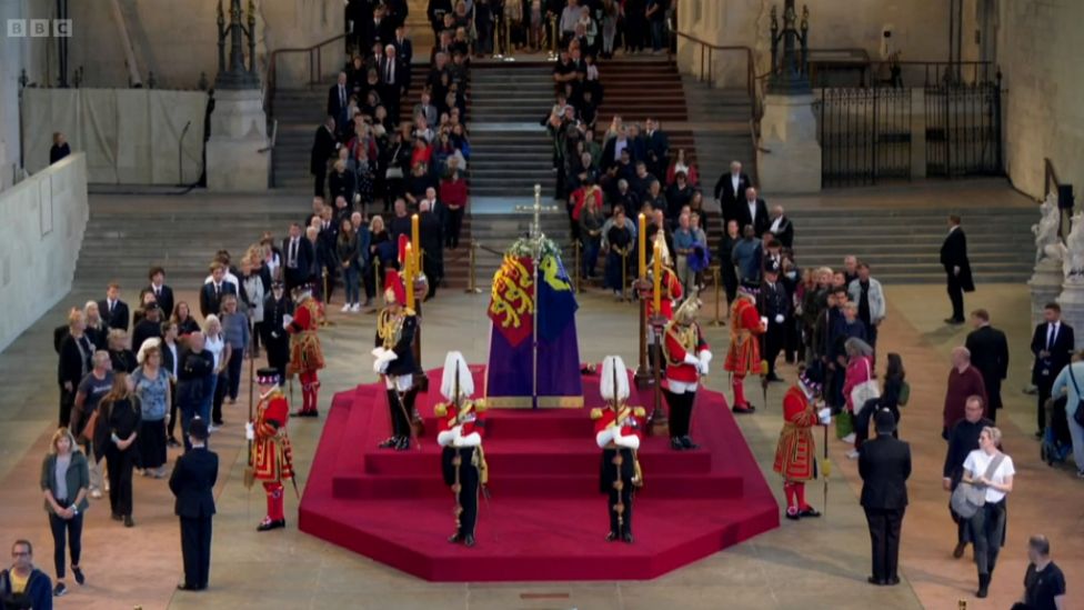 A koporsót szerda délután vitték a királyi család első számú londoni rezidenciájáról, a Buckingham-palotából lovak vontatta ágyútalpon a parlamenthez, ahol felravatalozták. A ravatalozóhelyiség a vasárnap éjfélig tartó időszakban minden egyes nap 24 órán át - esetenként egy-egy órás takarítási szünetekkel - nyitva lesz. A ravatal hétfő hajnalig látogatható, de a becsült várakozási idő alapján a hatóságok várhatóan már előbb lezárják a sort az újonnan csatlakozni kívánók elől. A londoni hatóságok előzetes várakozása szerint a vasárnap éjfélig terjedő négy teljes nap alatt legalább 400 ezren keresik fel II. Erzsébet királynő ravatalát.