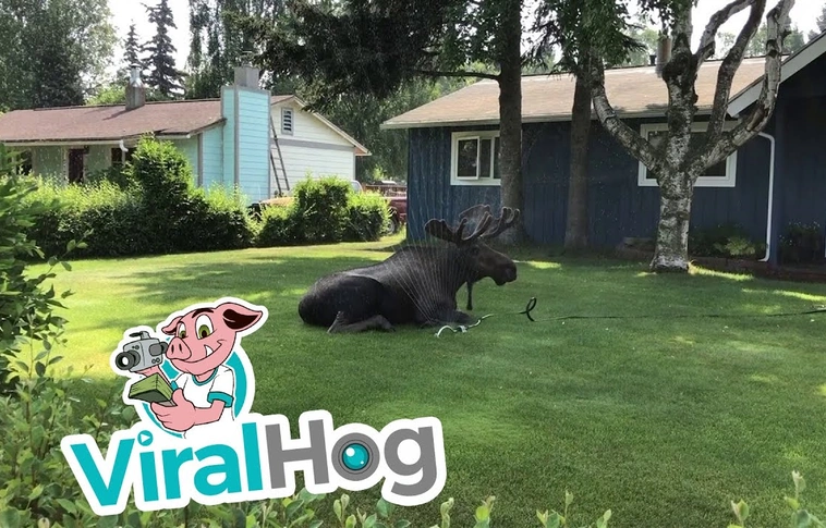 Egy ház udvarán, a locsoló mellett pihent megy egy jávorszarvas az alaszkai Anchorage-ben.