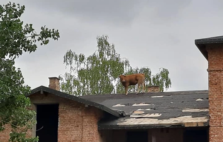 Kelet-Lengyelországban, Niewikla faluban történt a furcsa eset, hogy egy elkóborolt tehén egy kétemeletes épület tetején kötött ki.